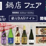 『鍋店フェア』開催! 3種飲み比べや鍋店のお酒に合う限定お料理をご用意!初日には好評イベント「蔵元 BARナイト」を実施!